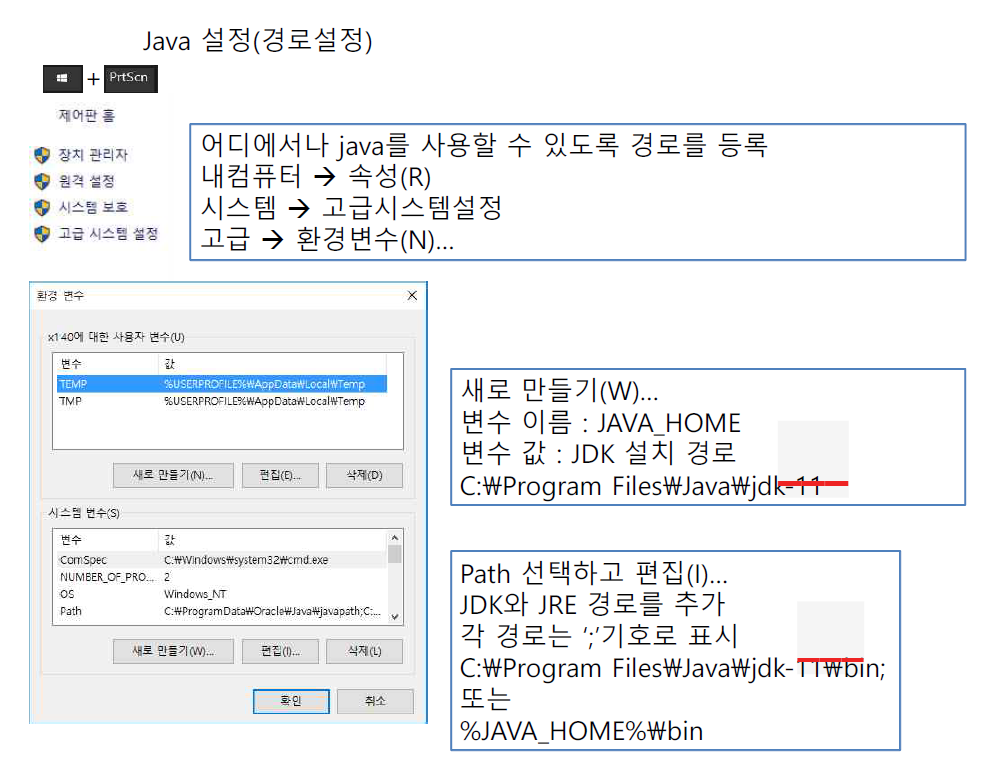 시스템 변수에서 Path 선택 후 '편집' - 새로만들기 - %JAVA_HOME%₩bin