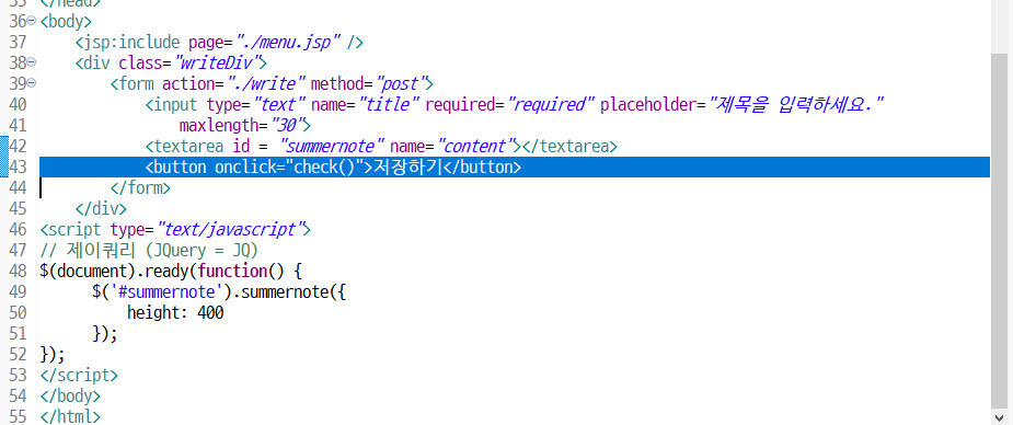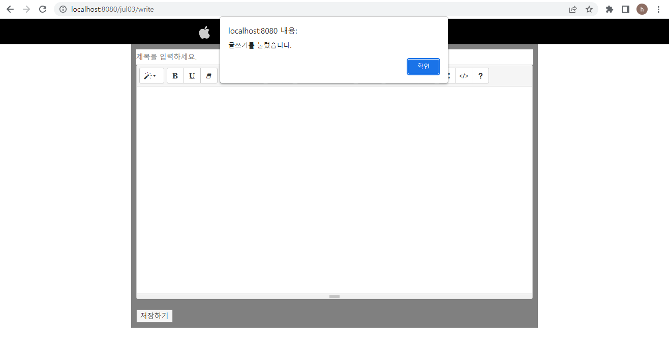글쓰기 - 저장하기 버튼 누르면 check() 함수 작동(팝업창)