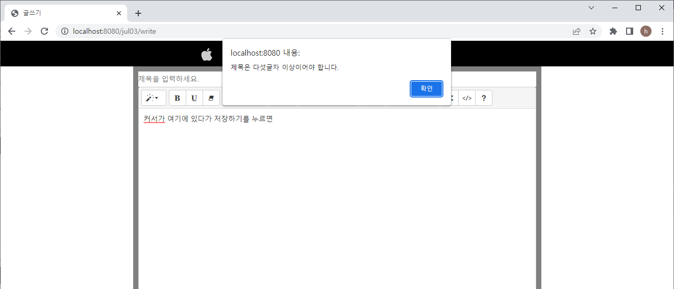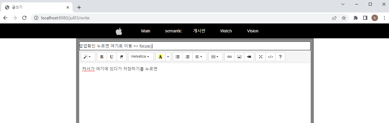 (제목 다섯글자 이상 입력 & 팝업창 확인 누르면 본문으로 커서가 이동해야 하는데 이동을 안함)